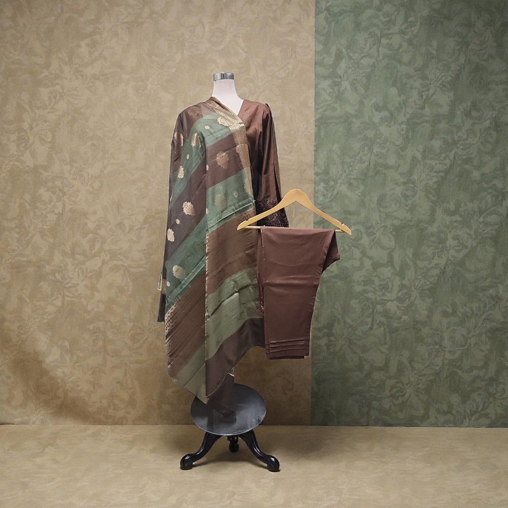 Featuring a beautifully designed shirt with piping inside, comfortable trousers, and a graceful dupatta.