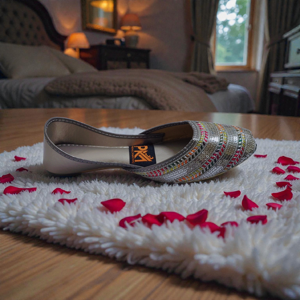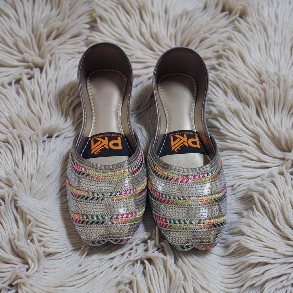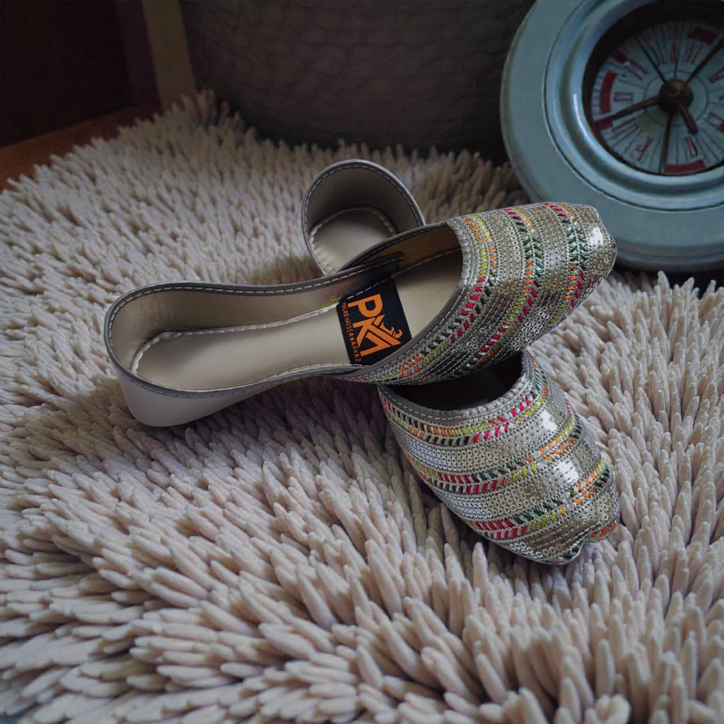 Fabric with Hand Embroidery Lining, Cushioning- Double padded sole, and back for some extra comfort to avoid blisters ANTI SLIP SOLE for all day comfort.